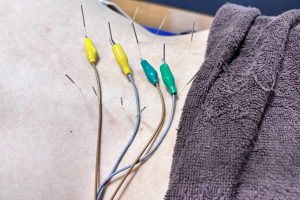 お尻からもも裏にかけての痛みの患者様。施術の様子